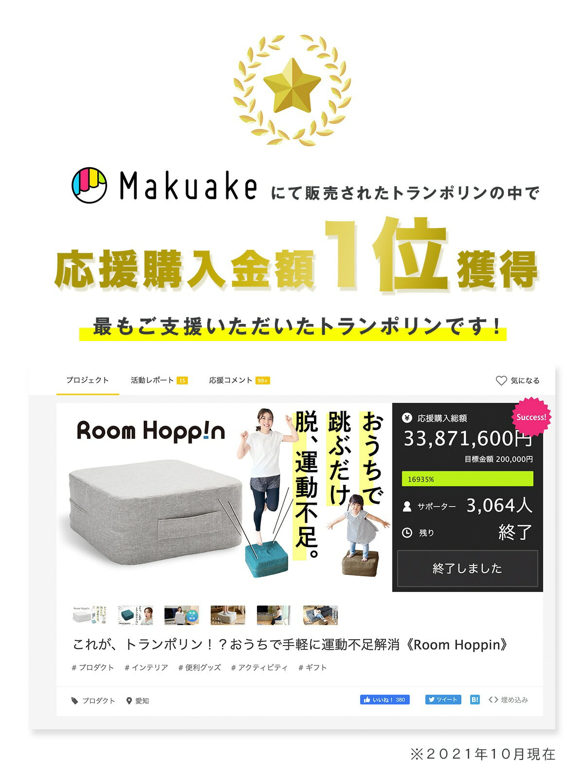 運動量については、実際に検査期間で試験を実施した結果、 ルームホッピン5分の運動で、歩行運動10分よりも カロリー消費量が66.1%アップすることが実証されています。