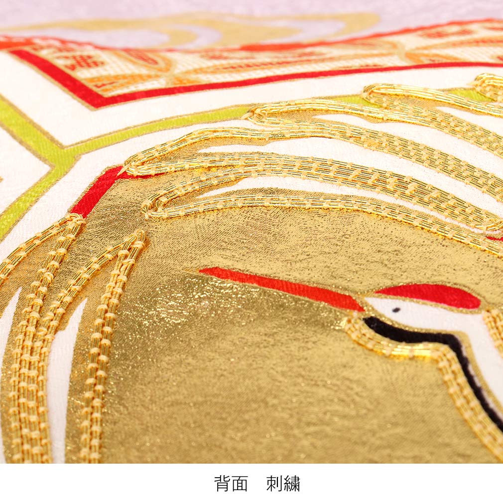 二対の鶴や打出の小槌には職人による丁寧な金駒刺繍が施され、浮かび上がる様などうっとりする程きれいなお着物です。