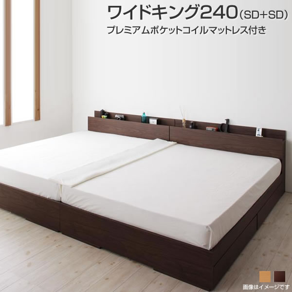 連結 ベッド 2台 収納 ワイドK240 (セミダブル×2) 収納付きベッド ジョイントマットレス付き コンセント付き 宮付き 棚付き ファミリーベッド 大きい 夫婦 家族 新婚 同棲 分割 連結 2台 3人用 子供 親子ベッド プレミアムポケットコイルマットレス付き