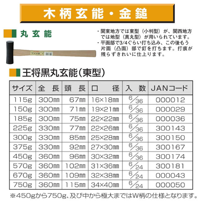 バリエーション規格:115g【全長300mm】規格:150g【全長300mm】規格:185g【全長300mm】規格:225g【全長330mm】規格:300g【全長330mm】規格:375g【全長330mm】規格:450g【全長360mm】規格:570g【全長360mm】規格:670g【全長360mm】規格:750g【全長360mm】小判型ヘッド形状で東型とも呼ばれる、主に関東地方でよく使用される木柄タイプの黒丸玄能! 2